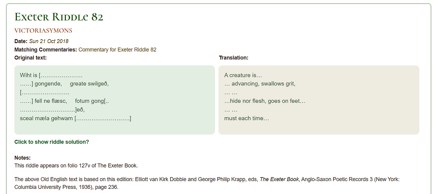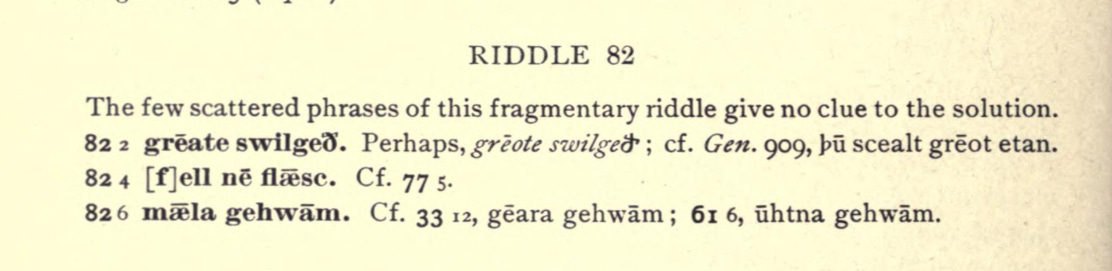 Some of the riddles in the celebrated Exeter Book are complete, and we know their solutions; some are complete and scholars argue over possible answers to them. But Riddle 82 is tantalisingly fragmentary, such that nobody is entirely sure what it’s saying, let along what its answer might be. Above is a screenshot from the excellent ‘The Riddle Ages’ website, where UCL’s Dr Victoria Symons offers her translation of the riddle’s four (of six) incomplete lines, and suggests possible answers. Suggesting possible answers is further than Frederick Tupper’s venerable The Riddles of the Exeter Book (Boston 1910) is prepared to go: