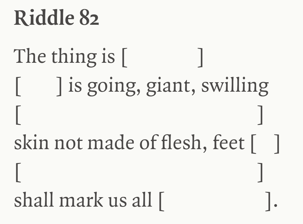 Oberman’s isn’t confected, as Pound’s is, although by printing it as a standalone poem, as he does, he taps into the suggestivity of Pound’s poetic strategy. ‘Riddle 82’ becomes a poem about something rather ominous: something with skin—a point of contact with us—but no flesh behind it; something growing, swallowing things as it goes, an already gigantic entity that, like Revelation’s mark of the beast, shall mark us. To which, for a poem published in 2017, makes me think: the internet.