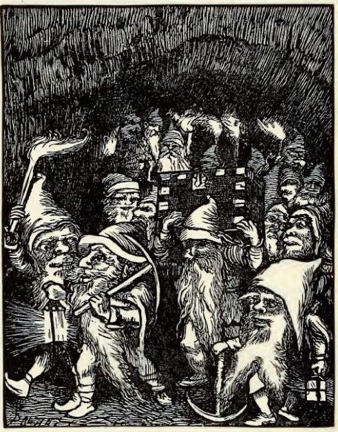Dictionaries still suggest that the word goblin, and its synonym kobold, derive from the Greek word, κόβᾱλος (kóbālos): ‘impudent rogue, arrogant knave’, and ‘(in the plural) mischievous goblins invoked by rogues’. But ‘Gideon’, in this fascinating post on the linguistic history of κόβᾱλος, demonstrates not only that the Ancient Greeks did not use the word to refer to goblin-style creatures, but that it came into English after the word goblin. Wiktionary has an alternate etymology for the German Kobold, which may be more relevant: ‘Kobe + holt’ a shed or sty ‘friendly one’, this last a euphemistic way of referring to dangerous supernatural entities: as with the Greek Eumenides. As to where κόβᾱλος came from, it might be related to κάβαξ (kábax, “crafty, knavish”) — or it might have something to do with κοβαλεύω ‘to carry as a porter’. Are goblins the embodiment of malevolent mischief?— something of which the world around us only too often seems to manifest, and which cries out to be anthropomorphised (like gremlins on an airplane) in our storytelling? Or are goblins, actually, our servants: bent double under the loads we make them carry, liable to rise-up and attack us if we don’t keep them down by beating them with a pickaxe, metal spar or sword?