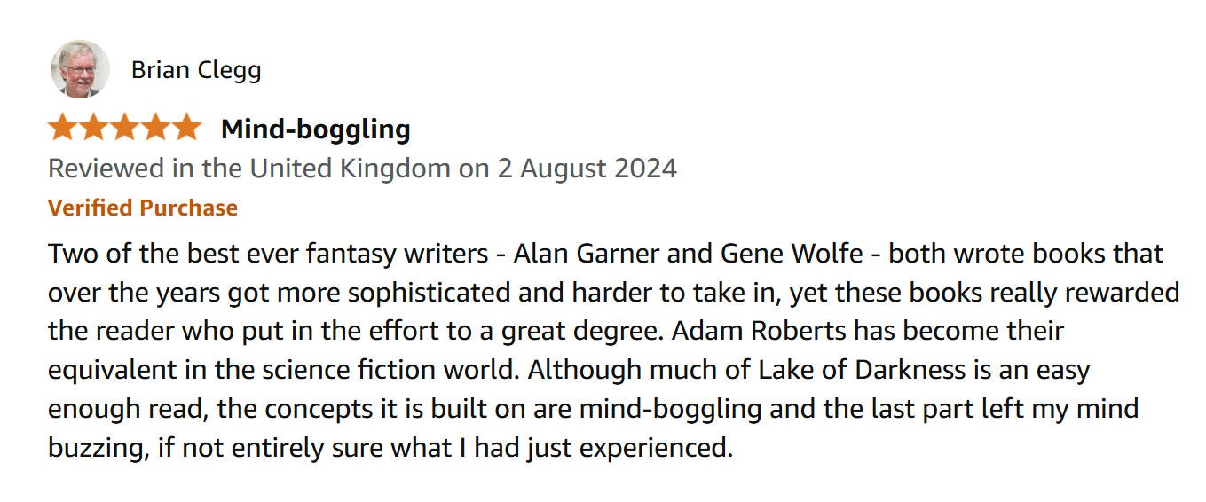 I don’t propose to use this Substack as a crude promotional platform, hectoring people to Buy! My! Books! and generally beating the marketing drum. There’s no need for that. But I will, to contradict myself, if only briefly, hereby note that today, the mass-market paperback edition of my novel Lake of Darkness is released. It’s a sort-of space opera, as well my first go at writing a Utopian novel, it has some speculations about cosmic geometry relating to black holes, and my teenage son (when I explained the concept to him: he hasn’t read it) suggested I call the novel Space Satan!!!—with that many exclamation marks. I should probably have listened to him.