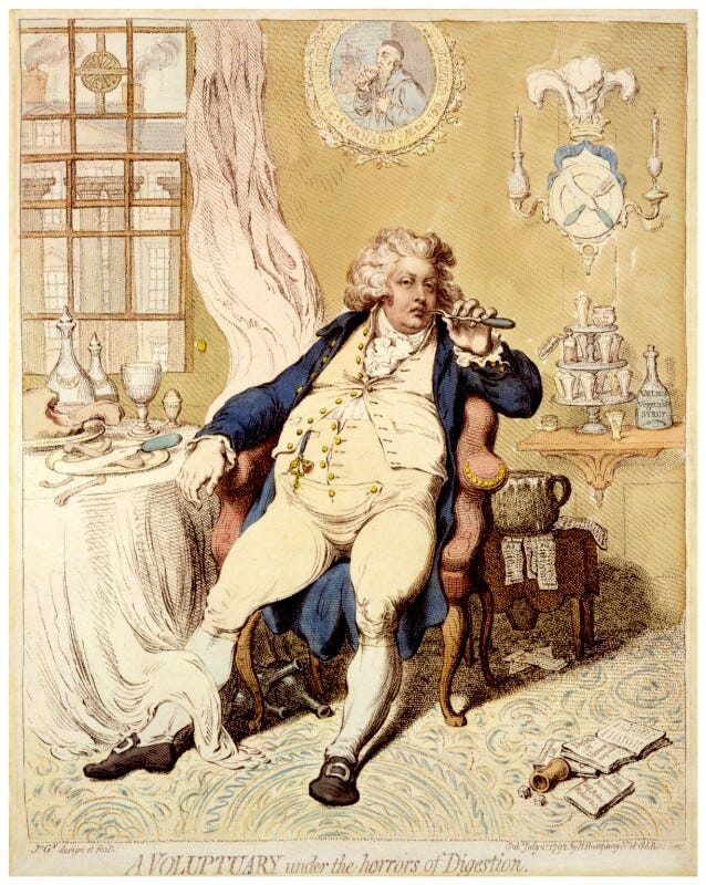 I don’t mean to be too hard on Hunt. He had personal reason to know how disproportionate and oppressive the authorities were liable to be where criticism was concerned. A sycophantic report in the press in 1813 describing the Prince Regent as ‘an Adonis in loveliness’ had provoked him: he had used the Examiner to scoff that this ‘“exciter of desire”—this “Adonis in loveliness”’ was ‘in reality a corpulent man of fifty!’