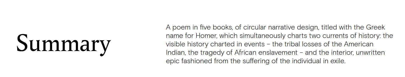 Bearing in mind that Omeros is Walcott’s most famous work, the book that (it is generally agreed) clinched him his Nobel Prize in Literature, that it is widely read, studied and taught, this is shocking stuff, wrong in almost every salient. The poem is in seven books, not five. It is linearly told, not circular. Its title is the Modern Greek for Homer, not the ‘Greek’ (the Ancient Greek for Homer is Homeros). It’s about characters on St Lucia: fishermen, other island inhabitants, the poet himself: it is not about (a relatively brief digression in book 5 aside) “the tribal losses of the American Indian.” It is not about “the suffering of the individual in exile.”
